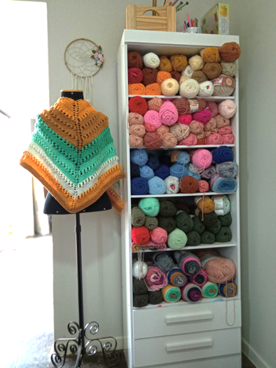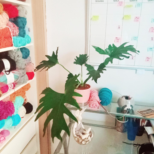 Em determinado momento da vida, usei duas partes de um guarda roupas. Em frente à ele ficava minha mesa de artesanato, com plantinhas e muita luz vinda da janela. As prateleiras eu usei para organizar os novelos, e as gavetas na parte de baixo, as peças menores. Em cima do guarda roupa, em caixas, peças e acessórios grandes. Assim, tudo que eu precisava estava sempre perto e eu evitava de levar a bagunça criativa para outros cantinhos da casa.