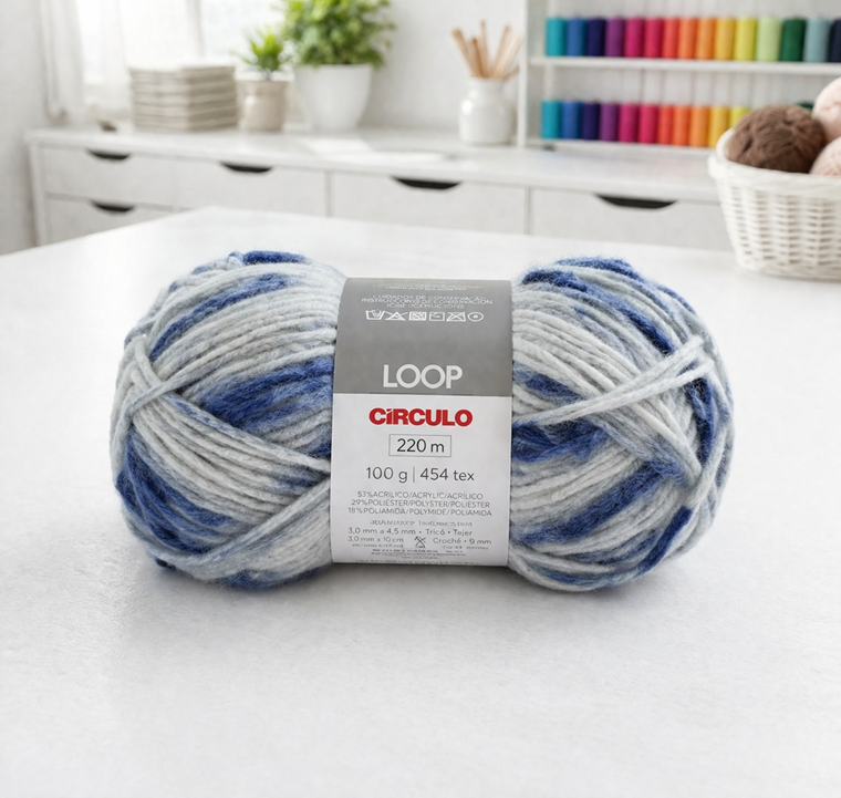 O Loop tem 220 metros em 100g, com 454 tex e uma composição de 53% acrílico, 29% poliéster e 18% poliamida. É indicado para agulhas de tricô entre 5.5 mm e 7.0 mm, formando peças mais macias e com volume. Fica lindo em mantas, golas, cachecóis e peças mais simples e rápidas de fazer, principalmente aquelas que valorizam a textura. Para peças com muitos detalhes, pontos rendados ou trabalhos mais elaborados, talvez não seja a melhor escolha, porque o fio já tem bastante presença e acaba “dominando” o resultado.