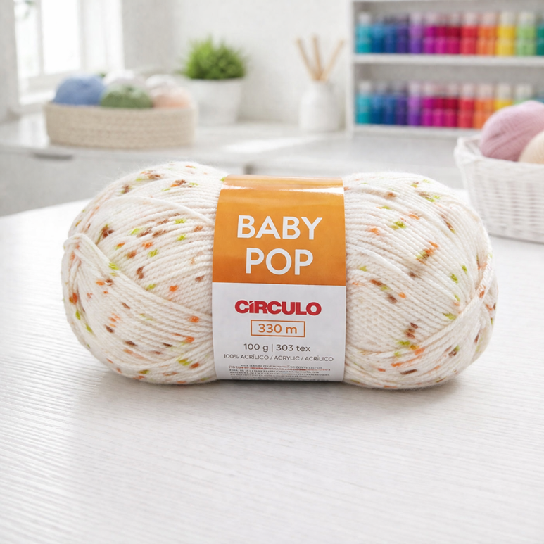 Ele vem com 303 tex, é 100% acrílico e tem um ótimo rendimento: são 330 metros em 100 gramas, o que costuma render bastante dependendo da peça. As agulhas recomendadas ficam entre 3.0 mm e 4.5 mm no tricô, o que permite uma variedade interessante de pontos. Eu vejo o Baby Pop funcionando muito bem em casaquinhos, mantinhas leves, blusinhas e acessórios infantis, principalmente peças de meia-estação. Já para peças que exigem mais estrutura, como casacos mais firmes ou pontos muito definidos, talvez não seja a melhor escolha, porque ele não tem aquela sustentação mais “encorpada”.