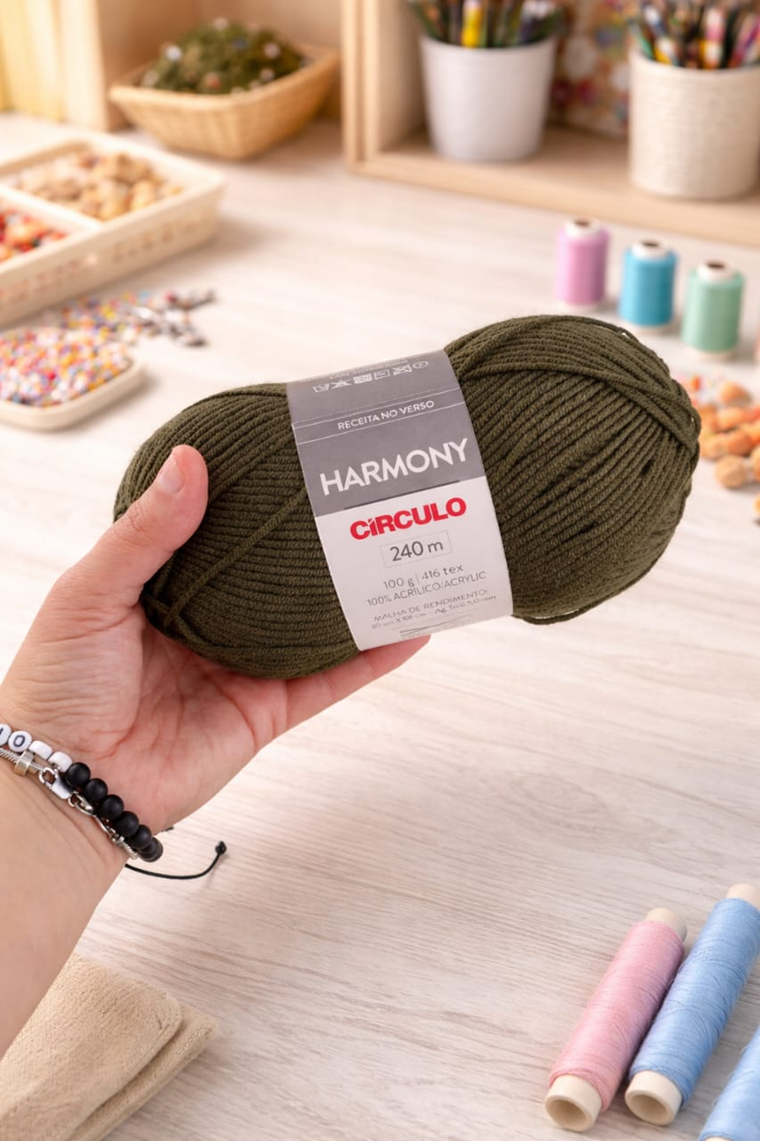 O Harmony é um fio acrílico de 416 tex, com 240 metros em novelos de 100 gramas. Trabalha melhor com agulhas mais finas (geralmente em torno de 5 mm) e pede alguns cuidados durante o manuseio: é importante evitar agulhas com pontas muito afiadas, que podem danificar o fio, e também não repetir muitas montagens, já que sua torção mais aberta pode sofrer alterações. Por fim, vale destacar seu excelente rendimento, que surpreende: é possível tecer um cardigan adulto de mangas longas, tamanho G, com apenas três novelos.
